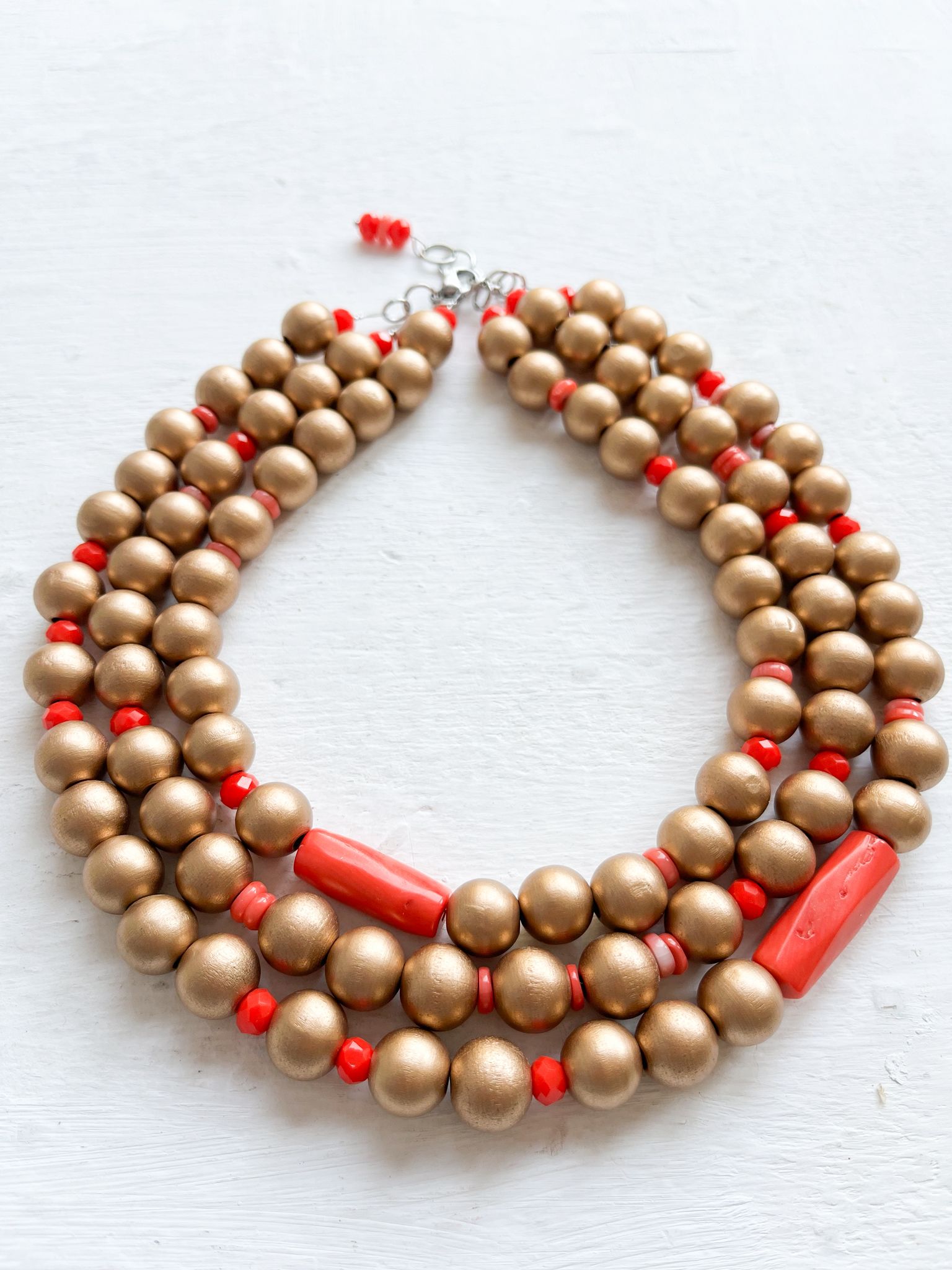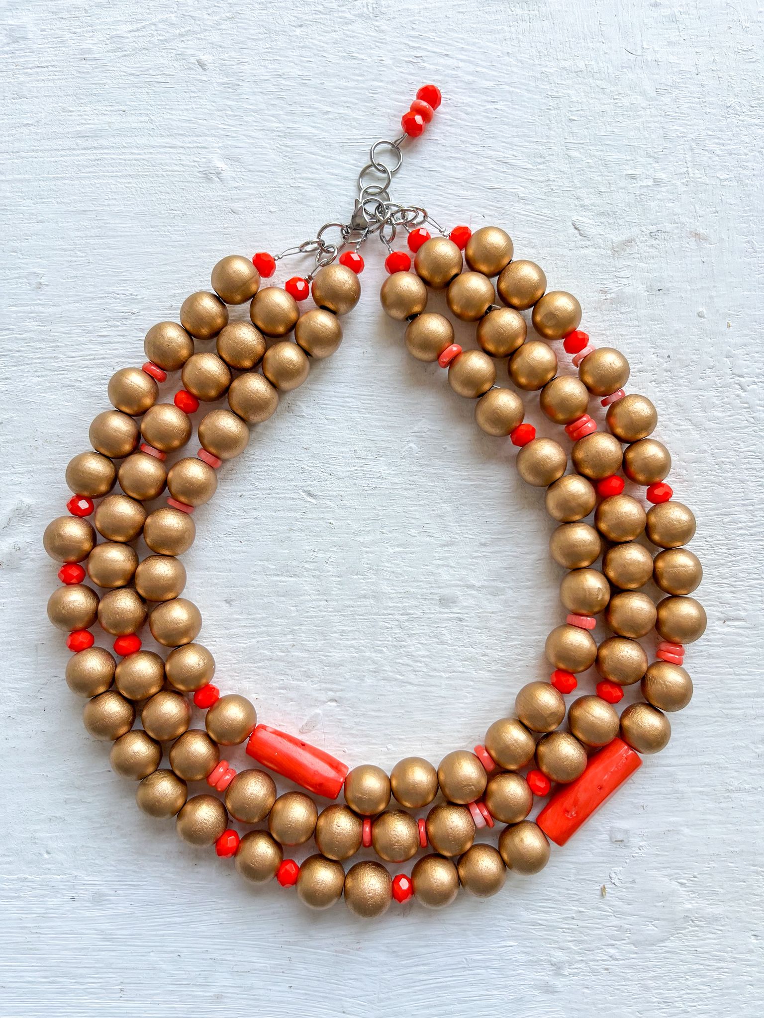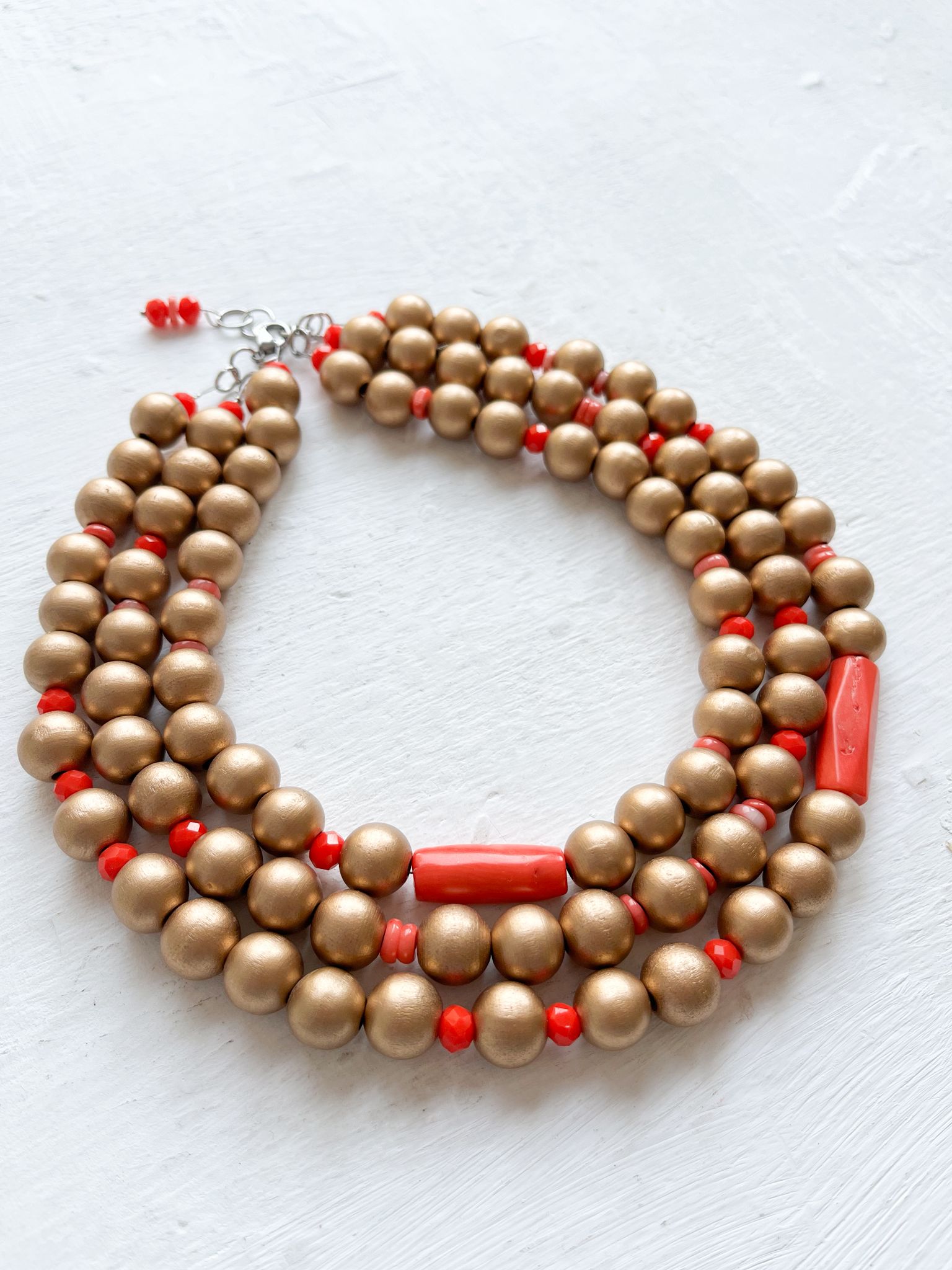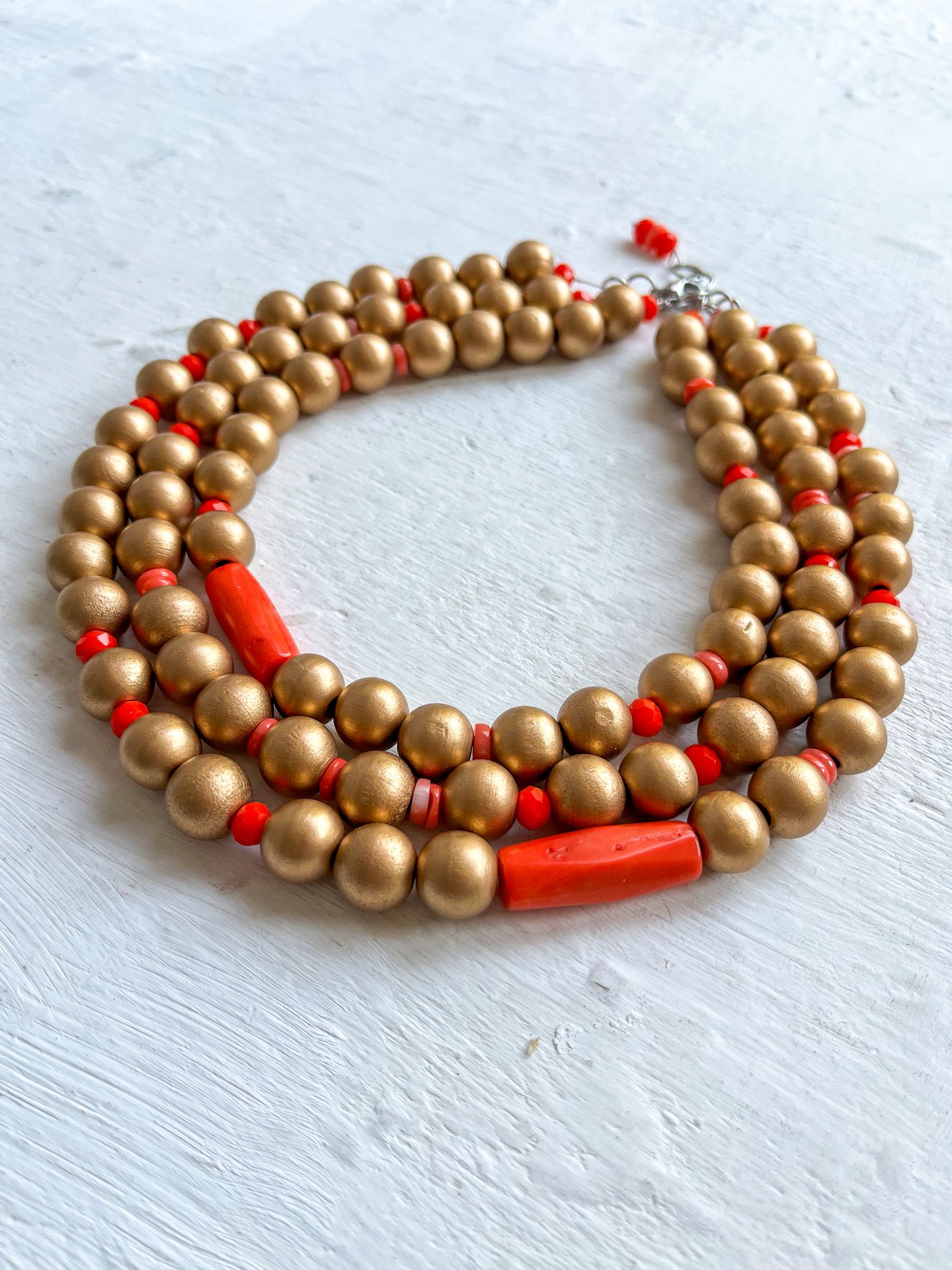 Cuentas de madera en oro viejo combinadas con cuentas de cristal facetado y Coral.