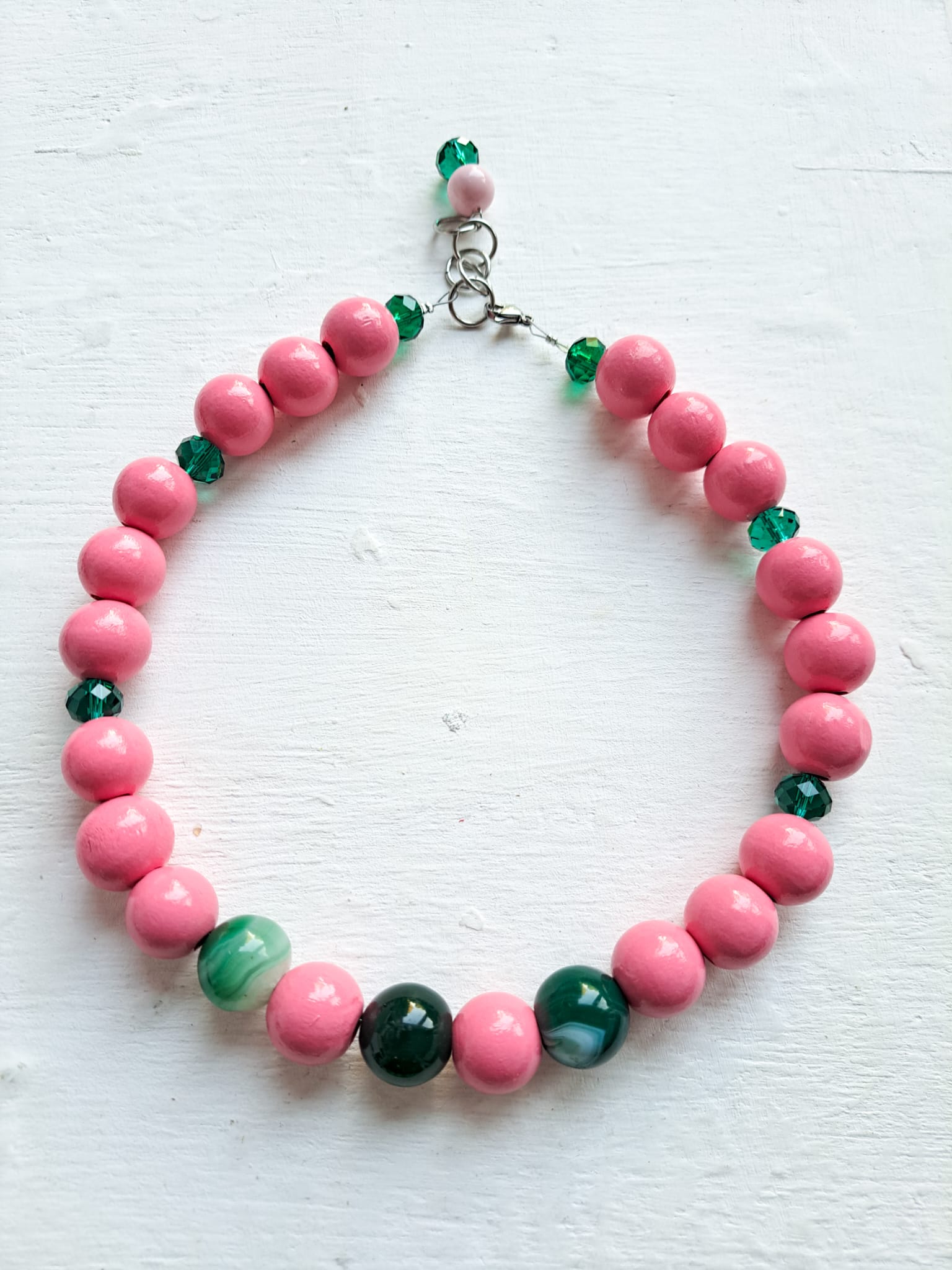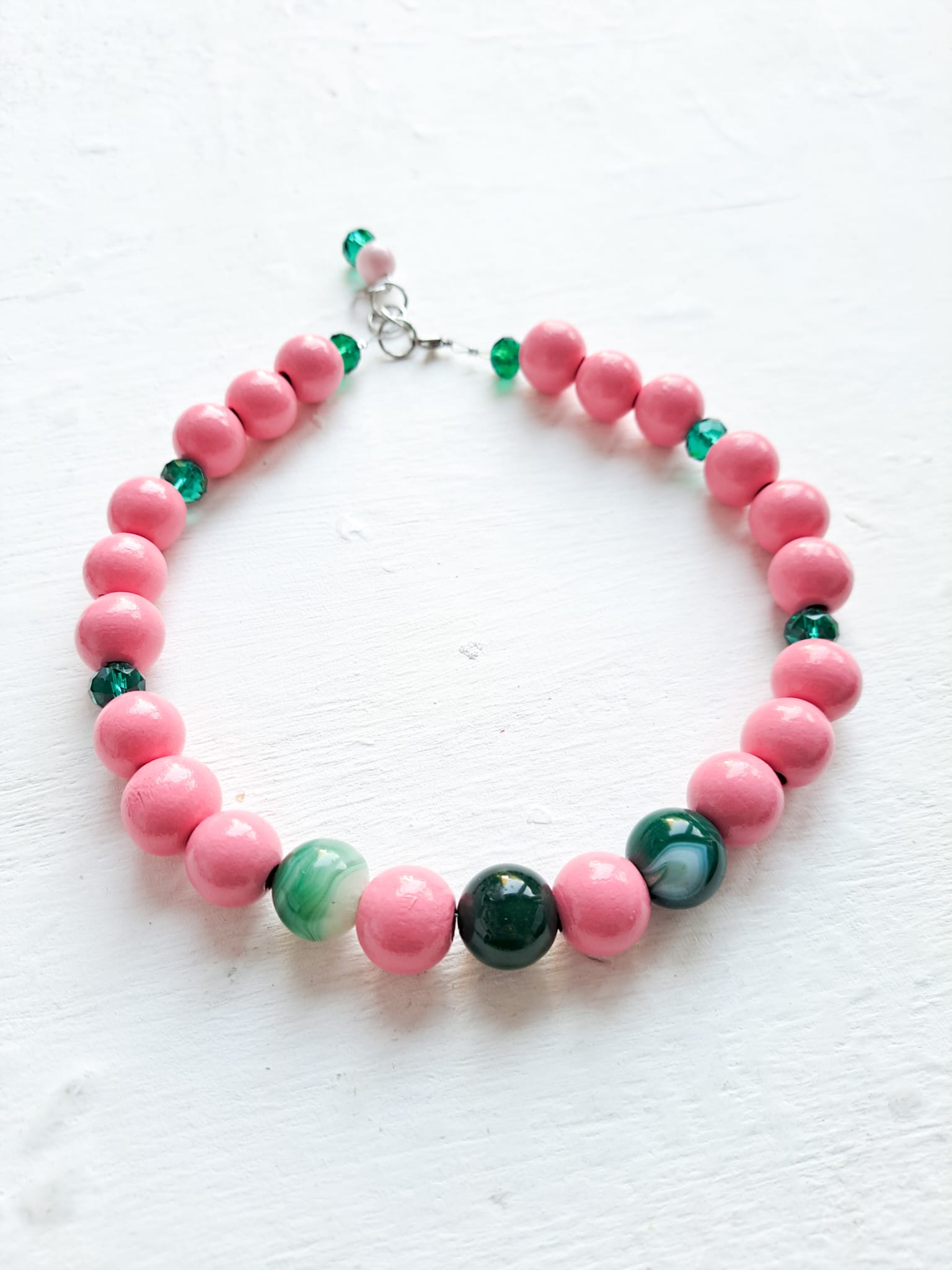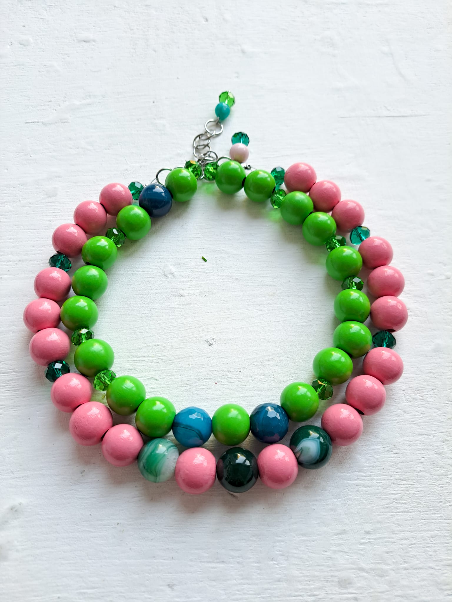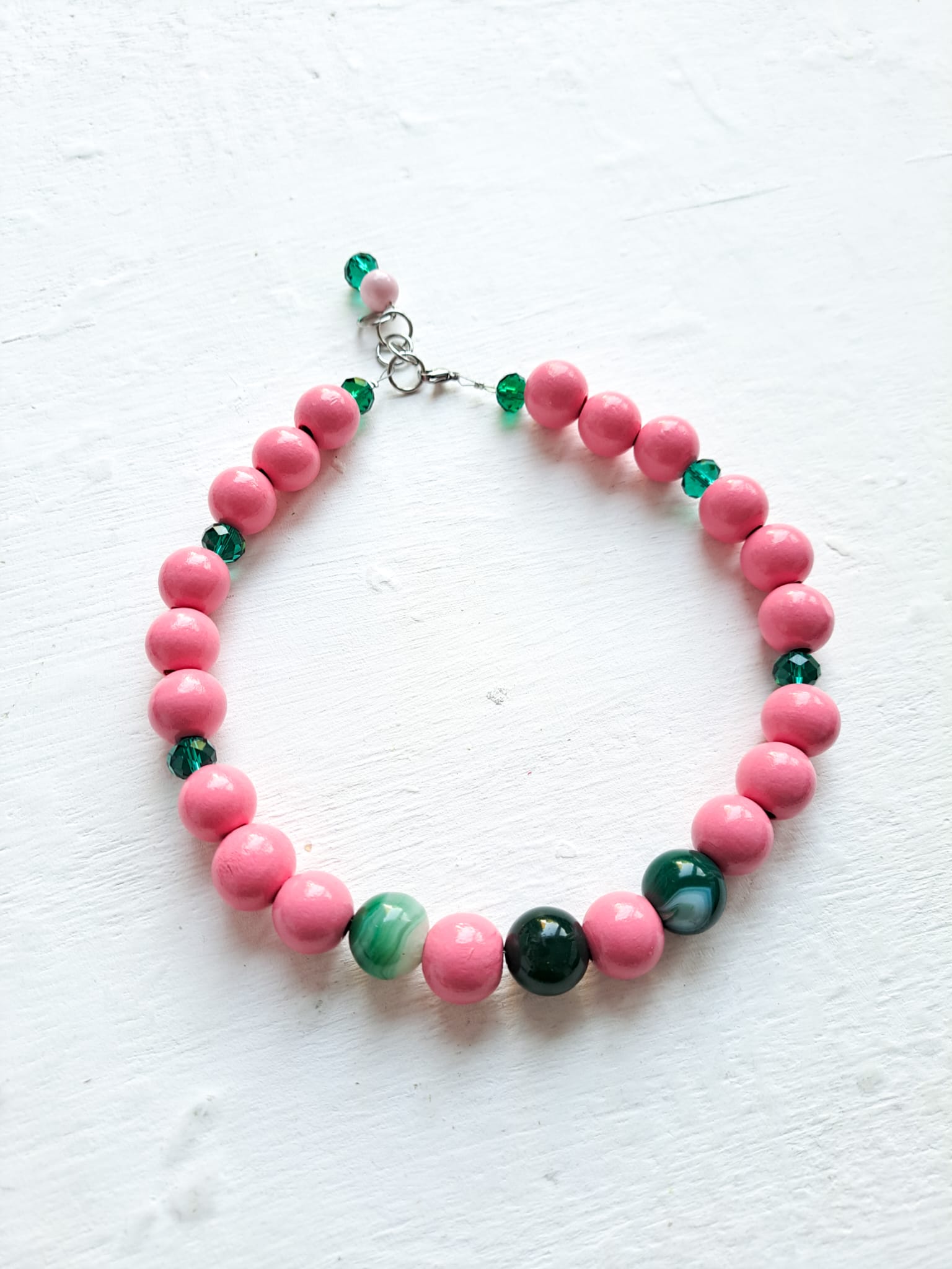 He combinado las cuentas de madera rosa chicle con cuentas de cristal facetado en verde y cuentas de Ágata en verde.