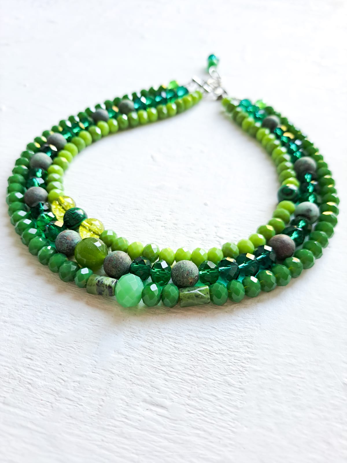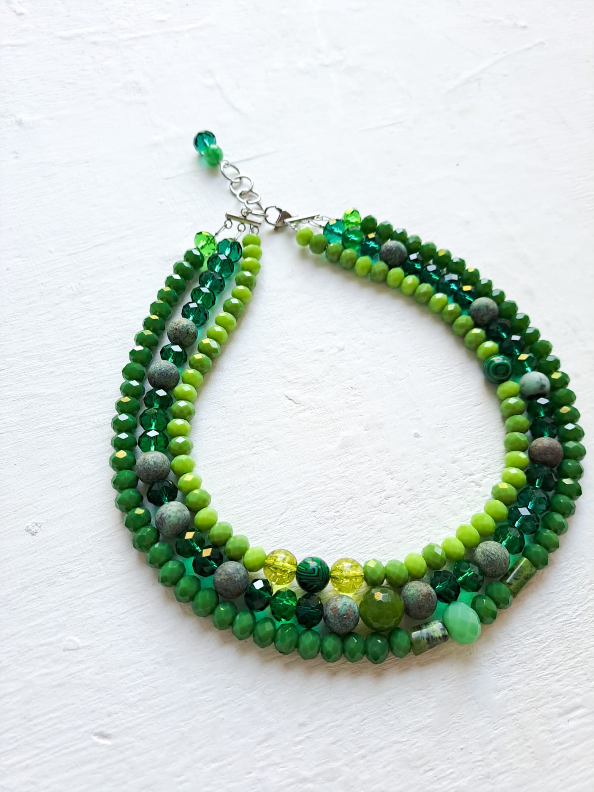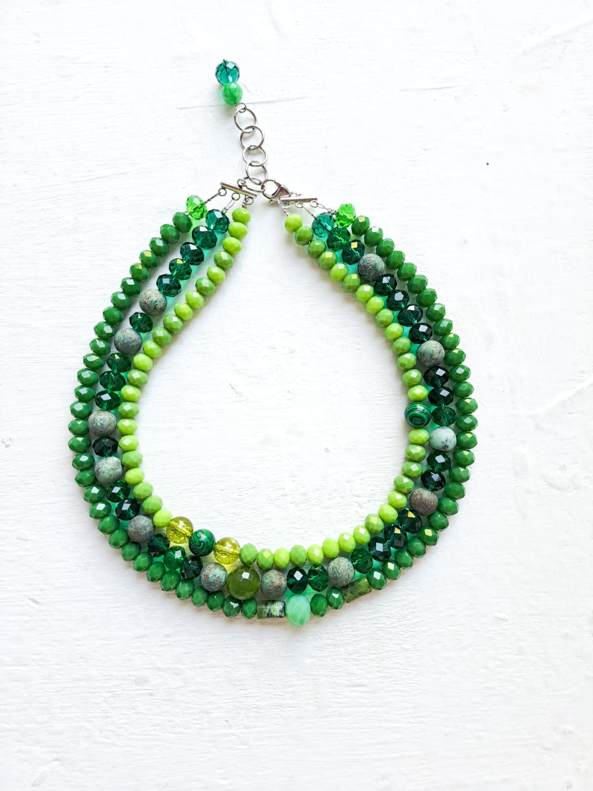 El verde me parece un color increíble, elegante y poderoso. Y esta pieza que combina las cuentas de cristal facetado de distintos en distintos tonos de verde, me parece increíble.