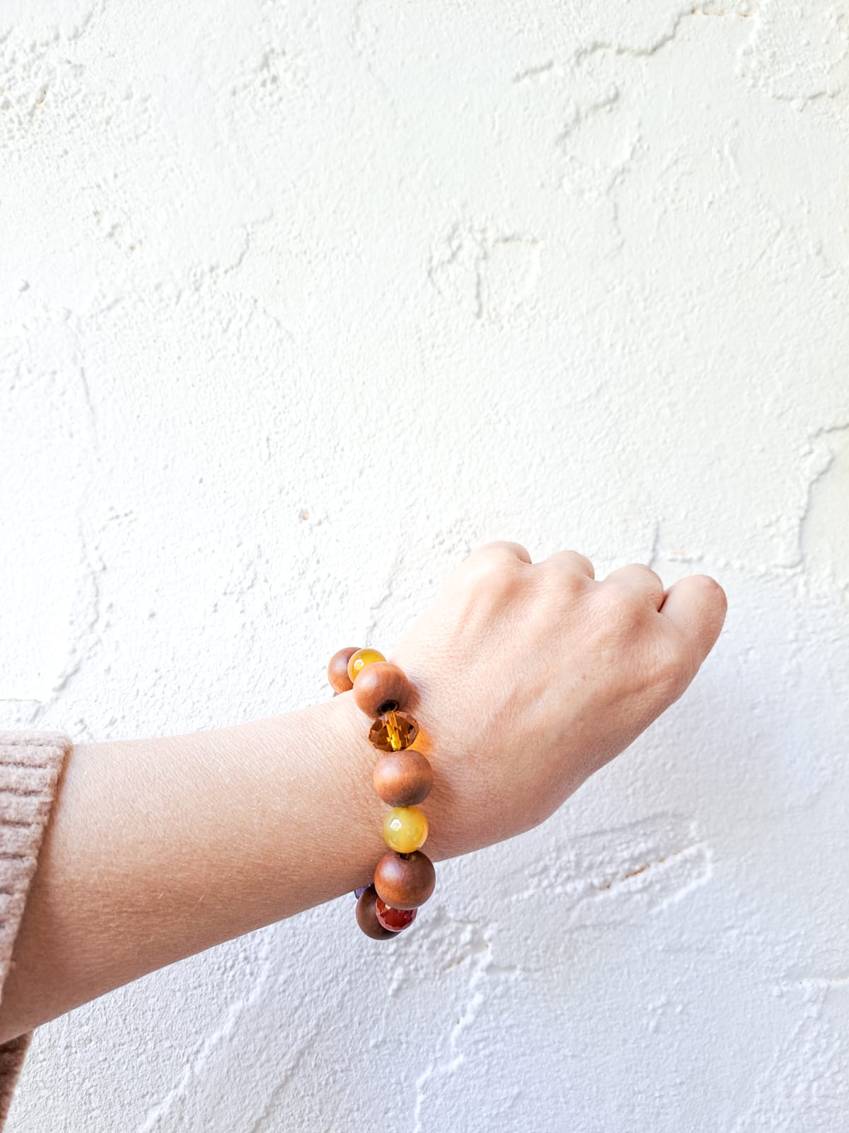 Pulsera elástica única, que combina las cuentas de madera marrones con cuentas de Ágata en marrón y ocre, y cuentas de cristal facetado en morado y ocre.