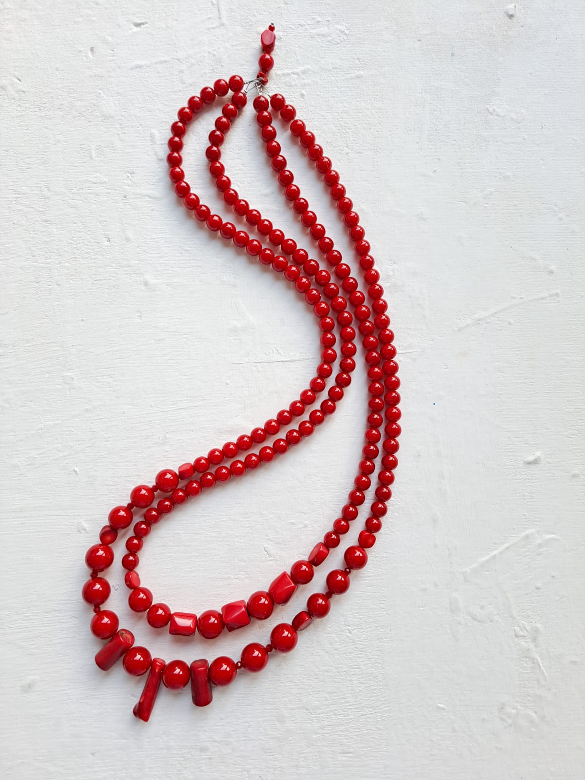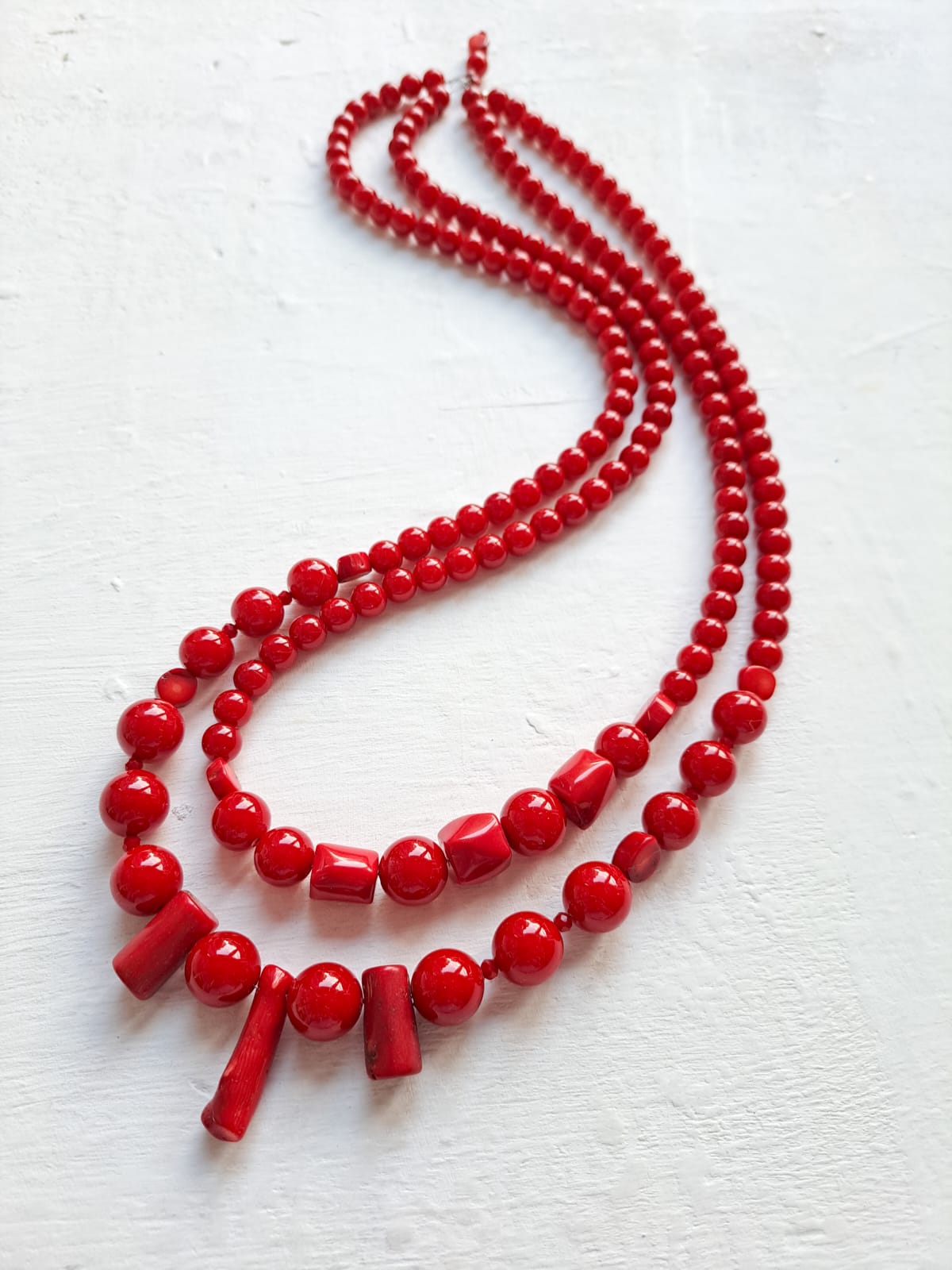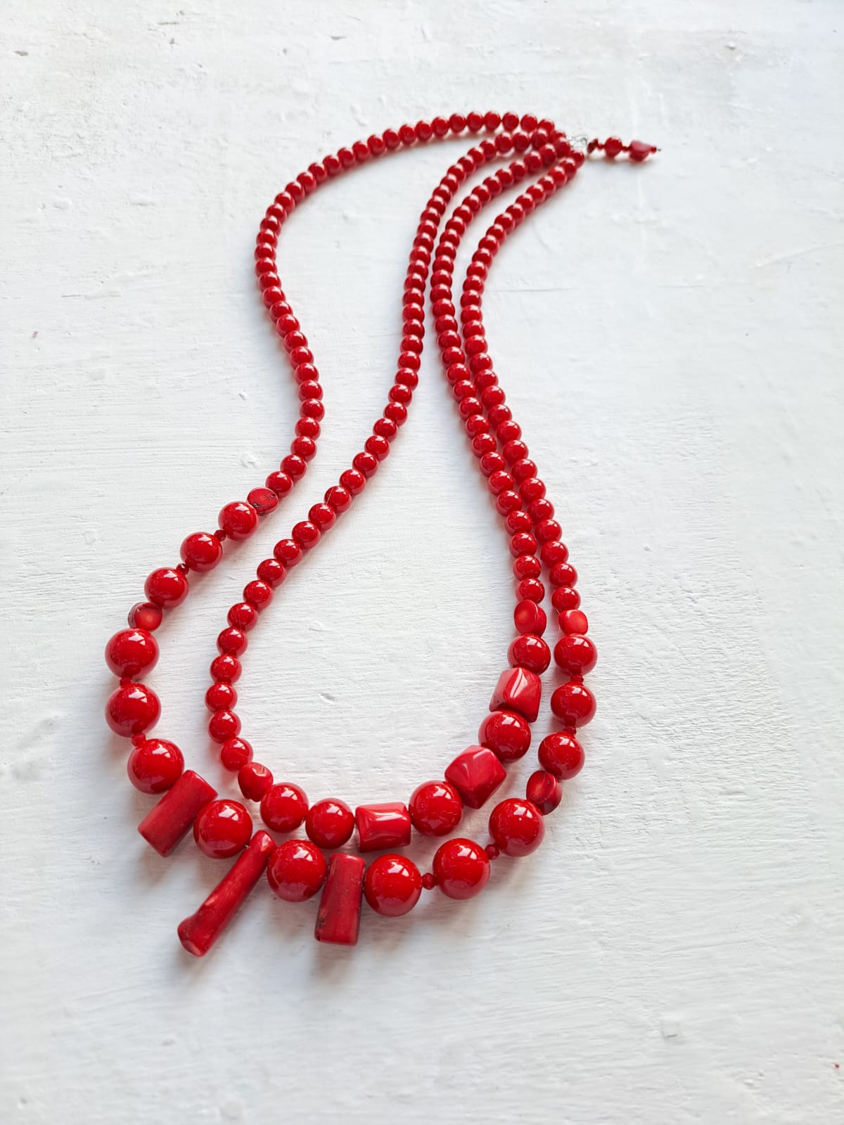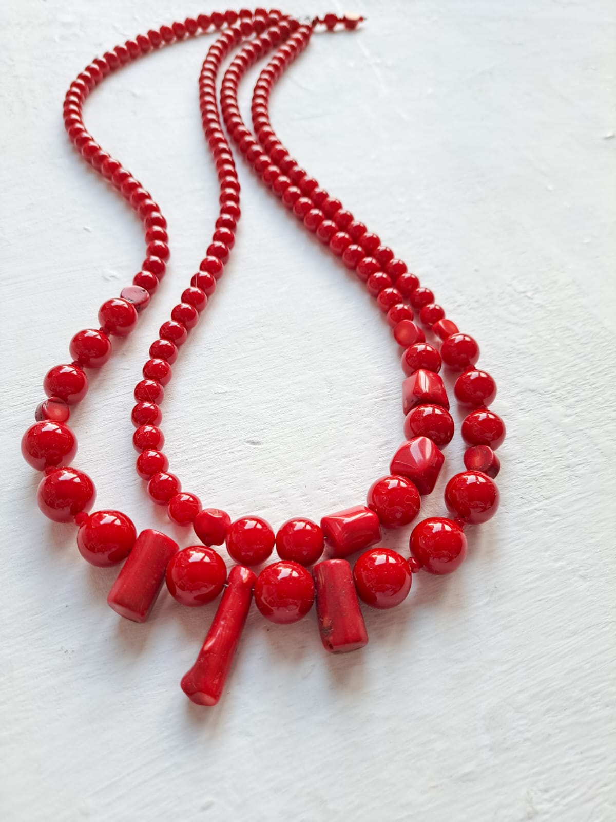 Collar largo de 46cm de dos vueltas, con cuentas de acetato, combinadas con cuentas de cristal facetado y corales de diferentes formas y tamaños.