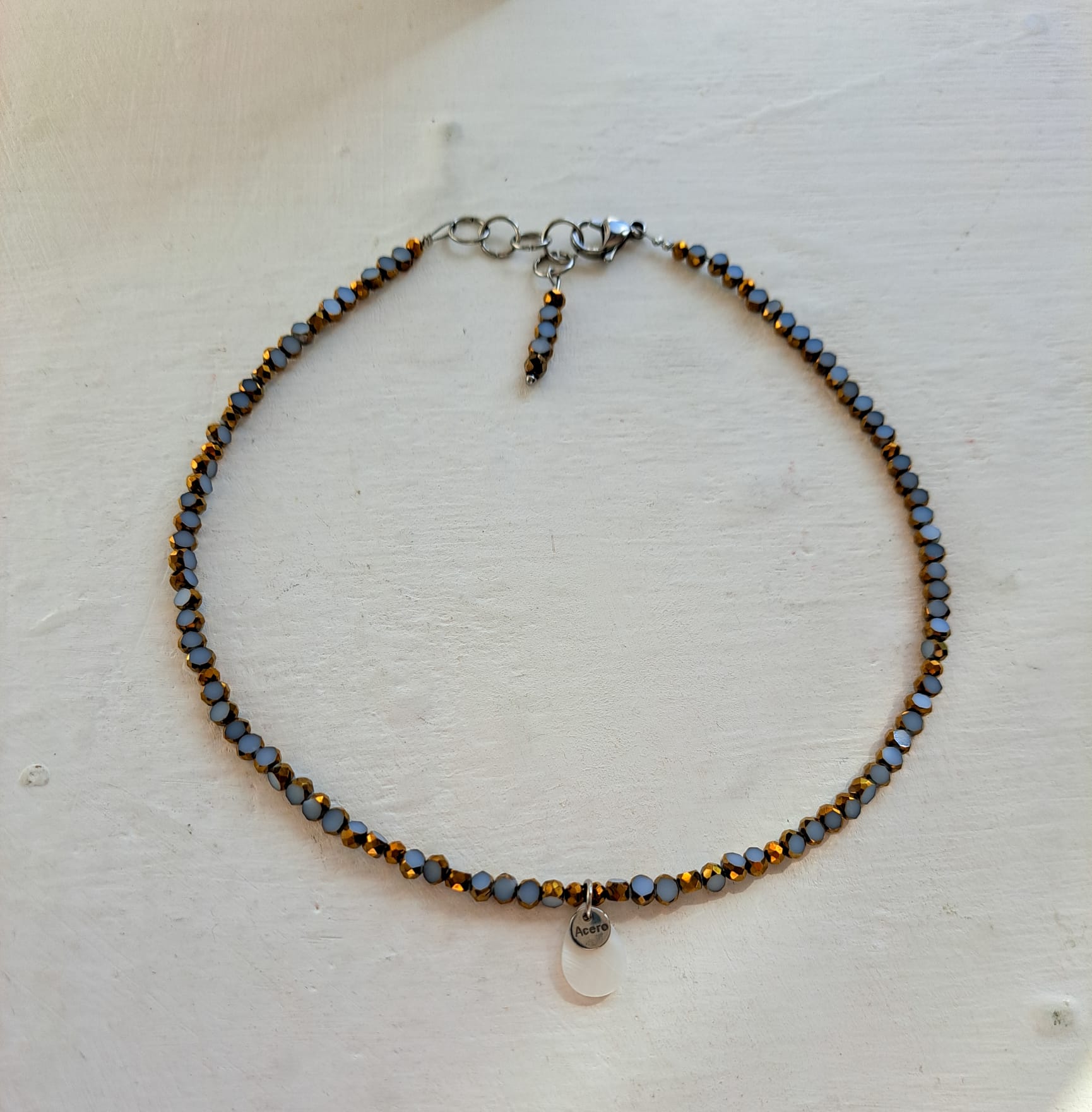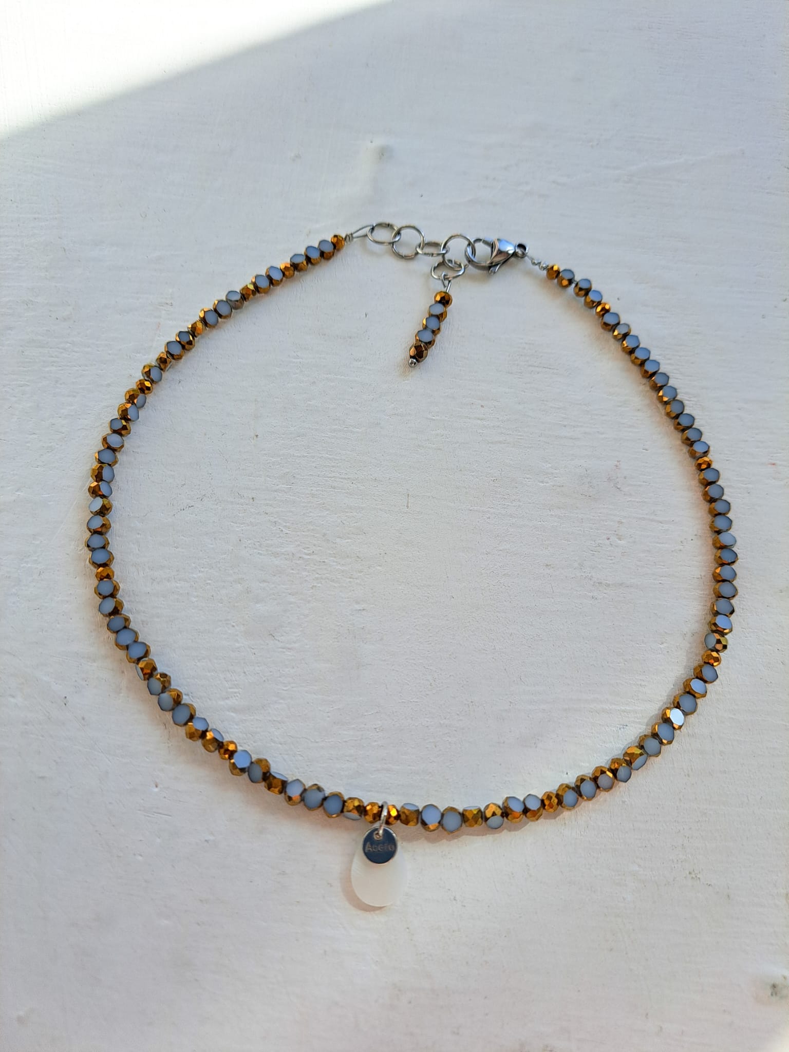 Hecho con cuentas facetadas en azul claro y oro. Lleva una gota de nácar con una medallita de acero.
